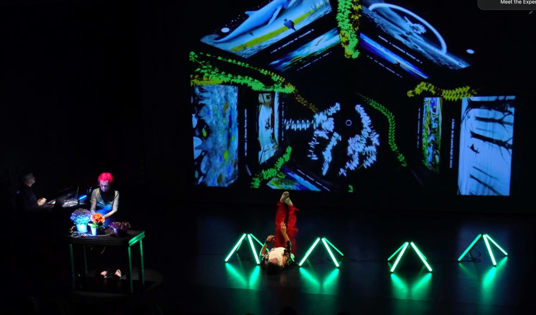 With a phhygital dramaturgy (hybridisation of physical-digital languages), the interactive actions of the audience and the performers activate sound and digital vegetation. Scenographic lighting elements respond to sound and chromatic inputs.